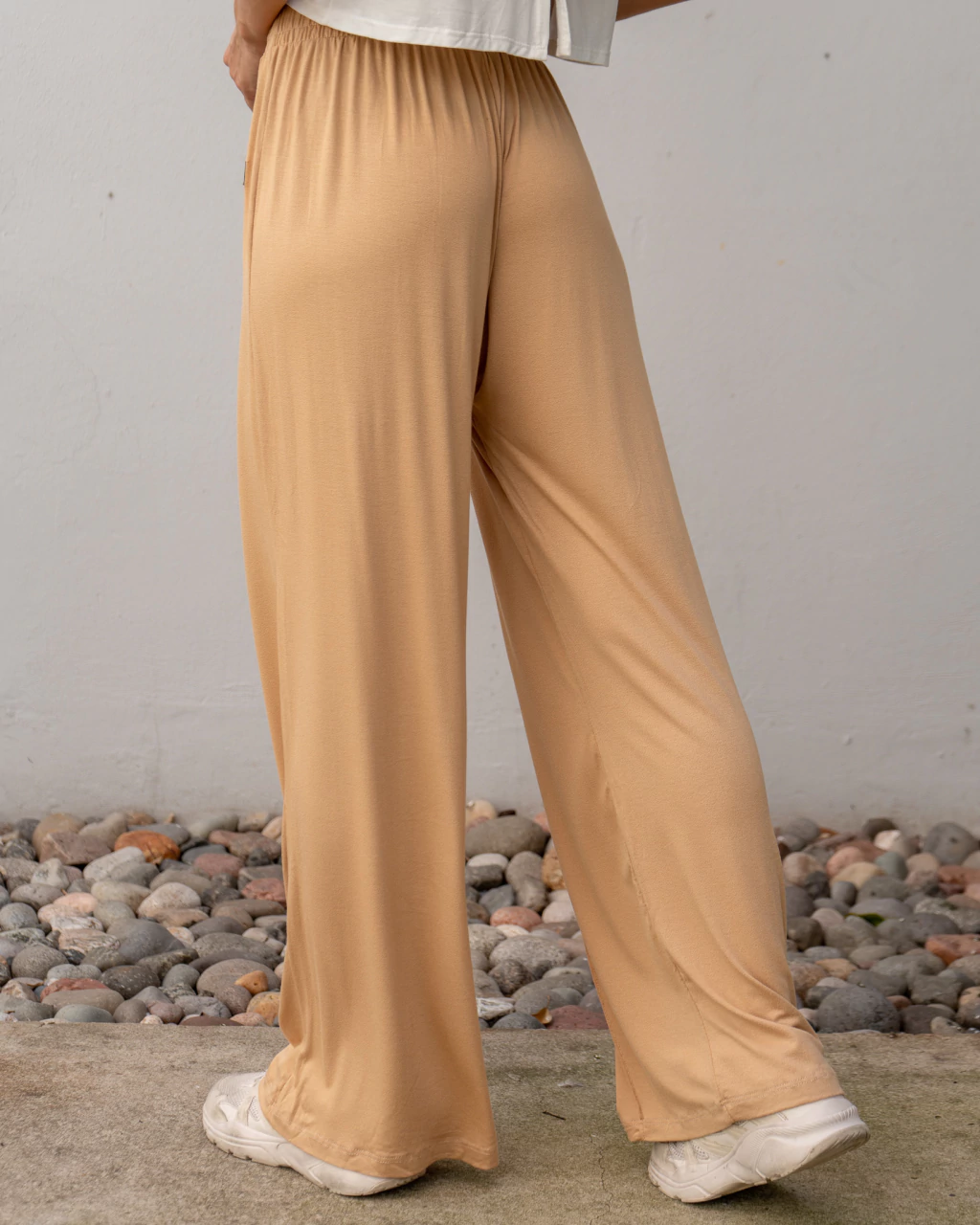 El Pantalón Amalfi es un palazo de crepe de algodón elastizado que cae perfecto y se mueve con vos.