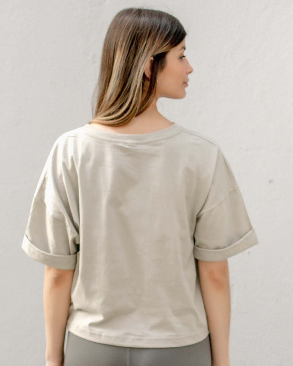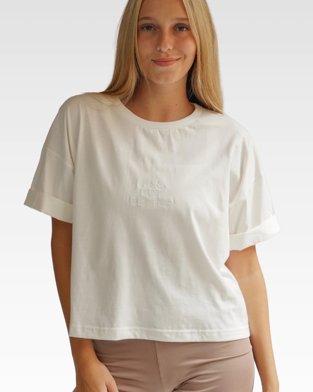 Manga corta, suelta, con mangas dobladas y bordada en el frente